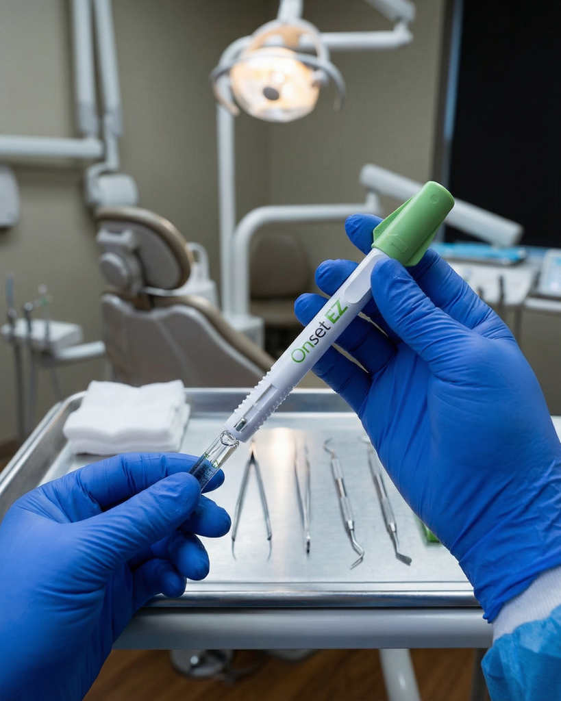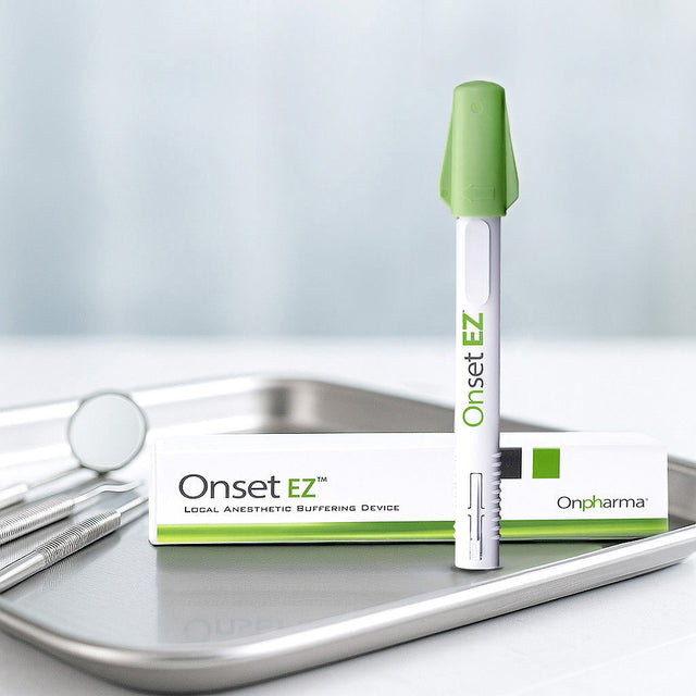 The Onset system is versatile and can be used to buffer the most common local anesthetics used in dentistry, including Articaine, Lidocaine, Prilocaine, and Mepivacaine. This allows clinicians to maintain their preferred anesthetic choice while still providing the benefits of a buffered injection.