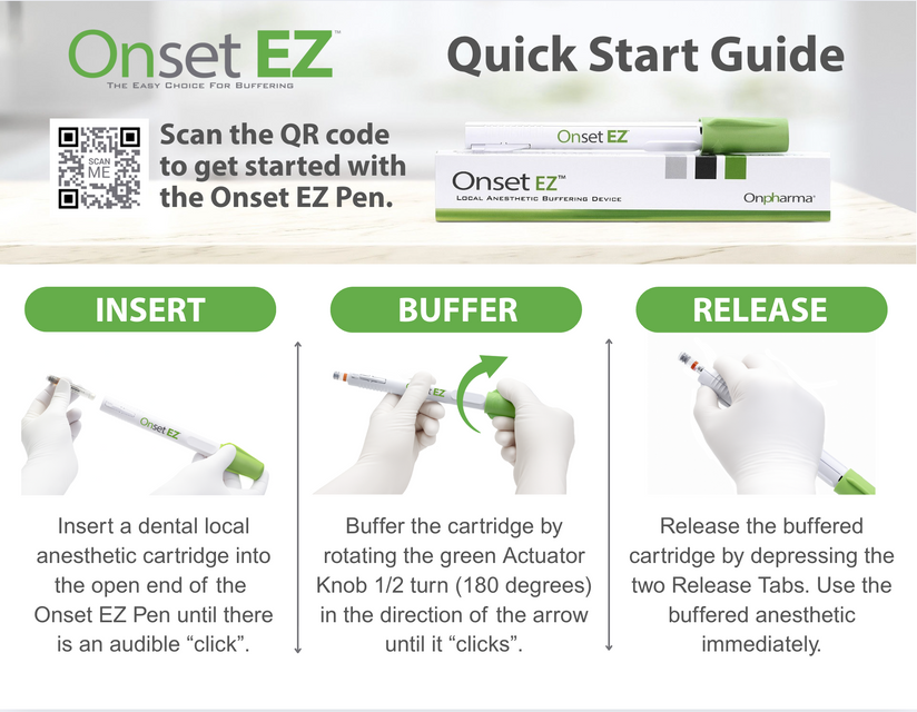 The Onset EZ™ Pen buffers individual cartridges of local anesthetic to adjust their pH to a more neutral pH prior to use. Each Onset EZ Pen contains a sterile solution of 8.4% Sodium Bicarbonate and Water for Injection, enough to buffer 30 local anesthetic cartridges.